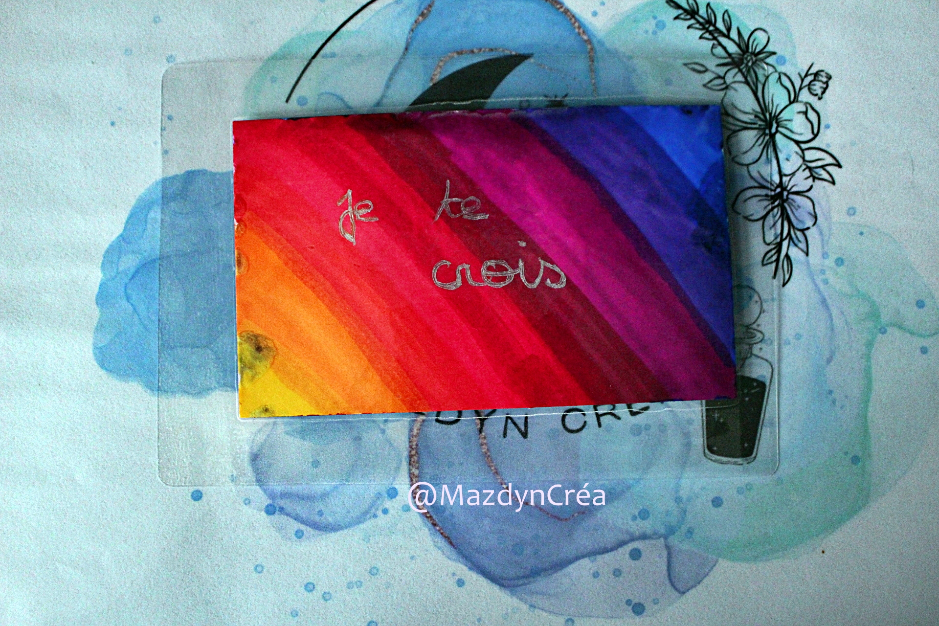 Fond dégradé de couleurs du bleu vers rouge, violet, forme de main entourant une lumière, sur une face, et la phrase, Je te crois, sur l’autre face