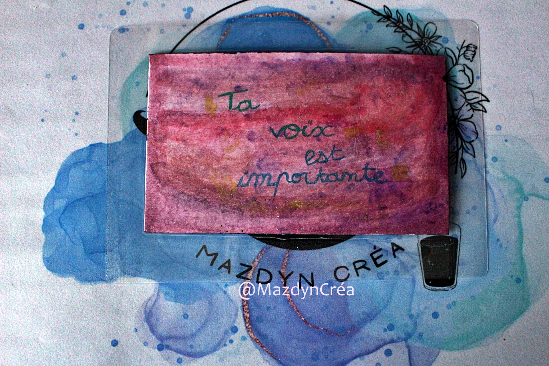 Fond sombre gris bleuté, des lumières perçant le sombre, sur une face, et la phrase, Ta voix est importante, sur l’autre face