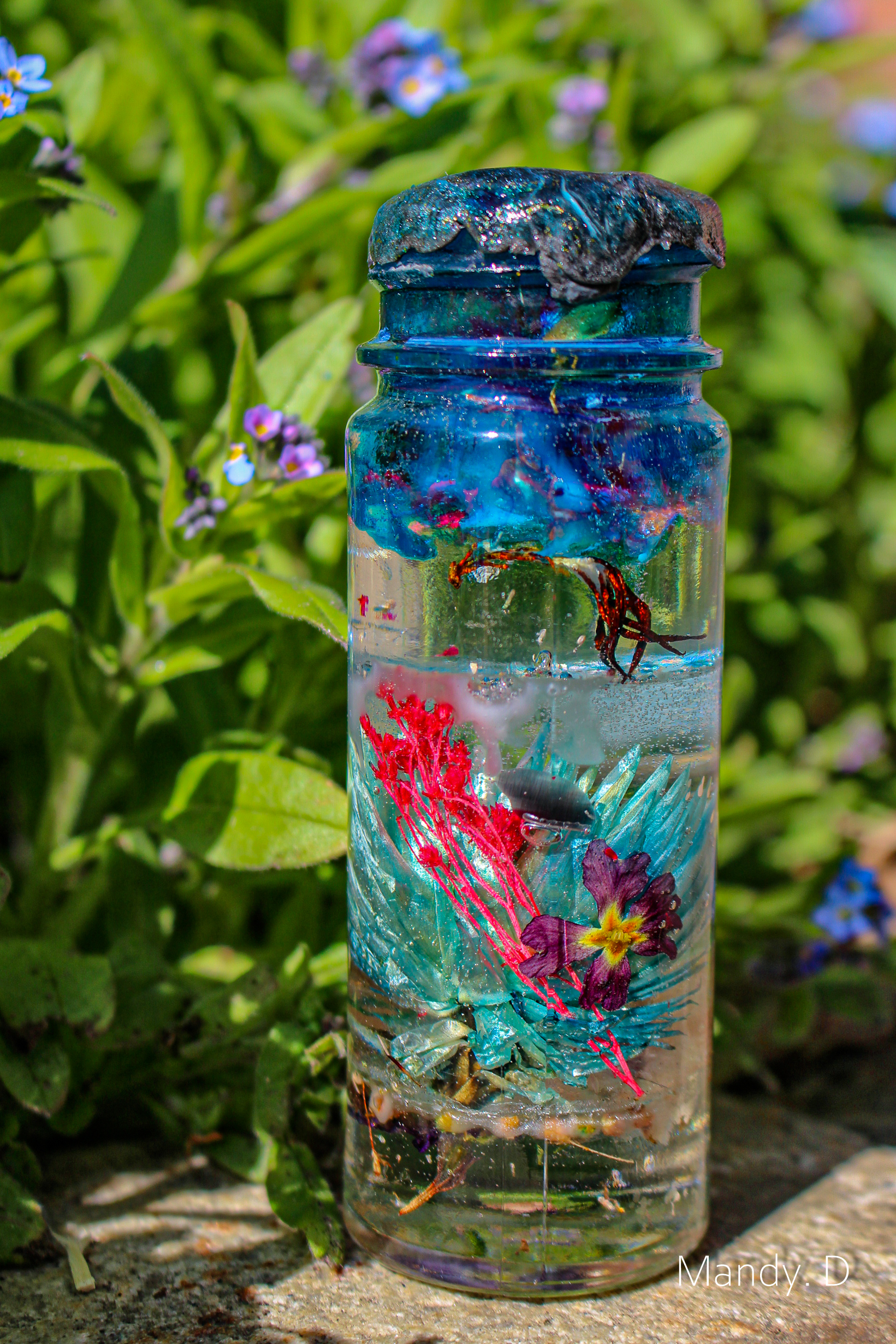Utilisation de résines, minéraux, encre. Je trouve que les bulles formaient par la résine donne un joli effet à la fiole.